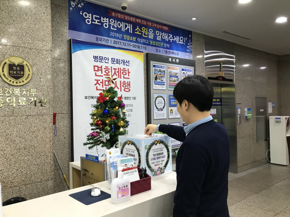 이어서 '영도병원, 산타가 간다'라는 주제의 이벤트도 함께 진행 중이다. 외부 정원, 외래 및 각 병동, 인공신장센터, 소화기내시경센터, 종합검진센터, 재활치료센터 등에 크리스마스트리를 설치하고 지난 11일부터 2주간 원무과 직원들이 크리스마스 캐릭터 머리띠를 착용해 고객을 맞이하고 있다. 크리스마스 이벤트로 23일에는 직원이 직접 산타복장을 하고 병동을 돌며 입원환자들에게 병원에서 마련한 기념품을 나눠줄 계획이다.
