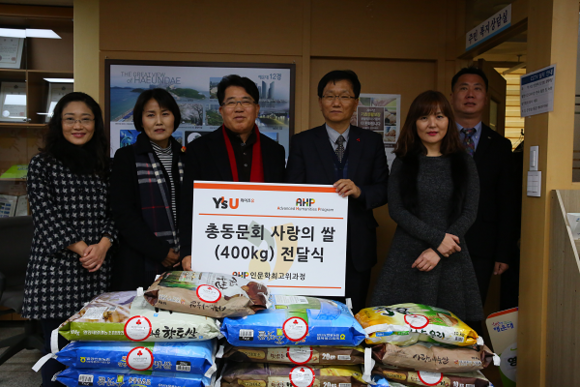 와이즈유 영산대학교(총장 부구욱) 인문학최고위과정(AHP) 총동문회(회장 김태일)가 14일 해운대구 반송주민센터에 쌀 400㎏을 전달했다.