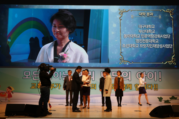 ▲14일 광주 김대중컨벤션센터에서 열린 '2017 교육기부박람회-제6회 교육기부대상 시상식'에서 박은경(오른쪽 세번째) 동아대 인문역량강화사업단장이 수상하고 있다. (사진제공=동아대)