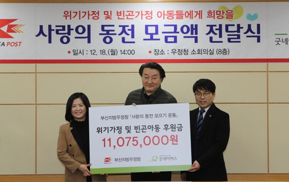 부산지방우정청(청장 전성무)은 부산·울산·경남지역 우체국과 취급국을 통해 '사랑의 동전' 1107만 5천원을 모금해 굿네이버스에 전달했다고 18일 밝혔다.