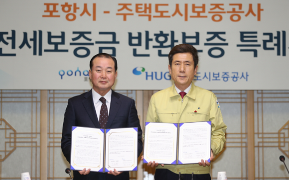 주택도시보증공사(HUG)는 포항시 지진피해 임차인의 주거안정을 지원하기 위해 27일 포항시와 '전세보증금 반환보증 특례지원 업무협약'을 체결했다.
