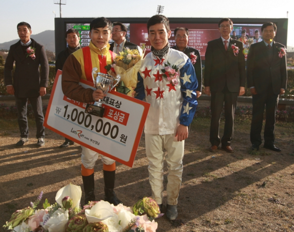 이 밖에 김영관 조교사와 조인권 기수는 홈페이지 인기투표를 통해 '고객이 뽑은 조교사와 기수'에도 선정돼 '최우수상'에 이어 '고객인기상'까지 획득하며 2관왕을 차지하는 영예를 누렸다.