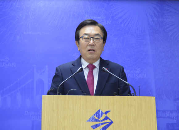 ▲서병수 부산시장이 4일 오전 부산시청에서 기장해수담수화 시설 가동중단과 관련해 기자회견을 갖고 있다. (사진=CNB 최원석 기자)