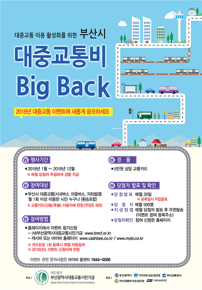 BIG BACK 이벤트는 부산 대중교통(버스 또는 도시철도)을 한 번이라도 이용하고, 이용한 교통카드 번호를 (재)부산광역시대중교통시민기금 또는 캐시비카드, 마이비카드 홈페이지를 통해 등록하면, 추첨을 통해 매월 500명(연간 6천명)에게 5만원 상당 충전교통카드(교통카드에 47천원 충전)를 등록한 주소지로 우편 배송해 준다. 작년에는 5만여명의 시민이 참여해 많은 관심을 보였다.