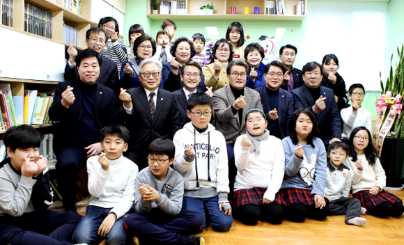 ▲문창용 캠코 사장(두번째줄 왼쪽 세번째), 유종필 관악구청장(두번째줄 왼쪽 네번째), 김흥권 대한적십자사 서울지사 회장(두번째줄 왼쪽 두번째) 등 참석자들이 '캠코브러리 15호점' 개관식 후 아이들과 함께 기념촬영을 하고 있다. (사진제공=캠코)