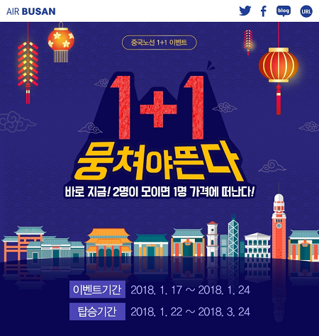 한 명 가격으로 두 명이 떠날 수 있는 이번 1+1 항공권 이벤트는 에어부산 홈페이지와 모바일 웹/앱을 통해 17일 오후 2시부터 24일까지 구매할 수 있다.