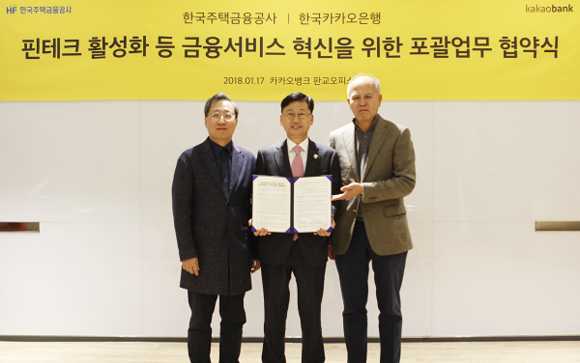 주택금융공사와 한국카카오은행은 17일 '핀테크 활성화 등 금융서비스 혁신을 위한 포괄업무 협약'을 체결했다고 밝혔다.