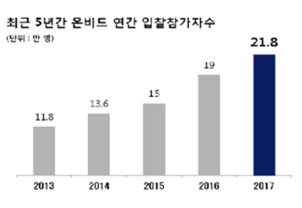 온비드 이용현황에 따르면, 2017년 입찰참가자 수는 전년도 19만명 대비 15% 증가한 21.8만명을 기록했으며, 연간 낙찰건수도 3만 7천건으로 지난해(3.3만건) 대비 12% 상승하는 등 5년 연속 증가세를 이어가고 있다.