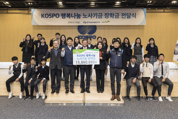 노사는 2013년 'KOSPO 행복나눔 협약' 체결을 통해 사회적 책임을 공동으로 성실히 수행하는데 뜻을 모았으며, 이후 매년 임직원이 자발적으로 모은 성금을 본사 및 발전소 인근 지역 청소년들이 보다 나은 환경에서 건강하게 성장할 수 있도록 장학금으로 지급하고 있다.