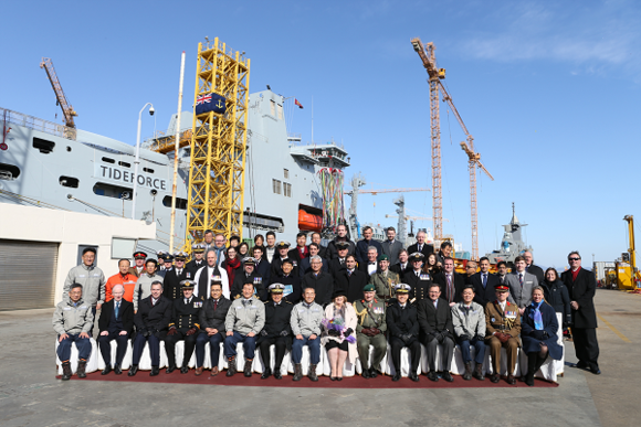 ▲24일 대우조선해양 옥포조선소에서 열린 영군해군 군수지원함 마지막 호선(4번함) 명명식에서 영군해군 및 대우조선해양 관계자들이 기념촬영을 하고 있다. (사진제공=대우조선해양)