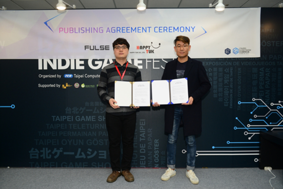 ▲최근 대만에서 열린 '타이페이게임쇼 2018'에서 펄스 이종성 대표, 대만 퍼블리셔 해피툭(happytuk) 최정필 이사가 계약 체결 후 기념촬영을 하고 있다. (사진제공=부산정보산업진흥원)