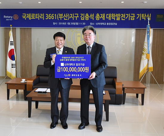 국제로타리 3661(부산)지구 김충석 총재가 신라대학교에 발전기금 1억원을 기탁했다.