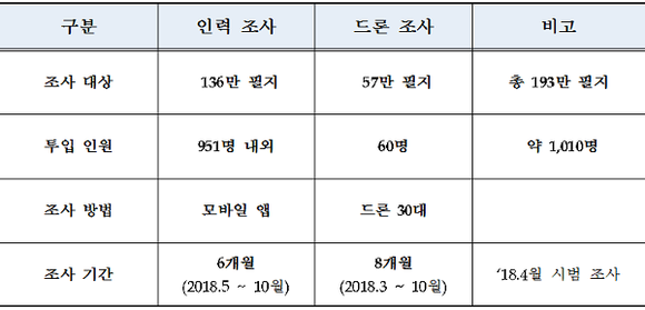 이 중 재산가치가 높고 현장 접근이 용이한 특별시·광역시 등 약 136만 필지는 모바일 앱을 활용한 인력 조사를 실시하고, 그 외에 면적이 넓고 접근성이 낮은 시·군 등 약 57만 필지는 드론 조사를 실시한다.