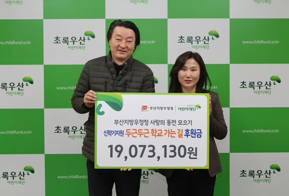 부산지방우정청은 지난 한 해 동안 부산·울산·경남지역 우체국과 취급국을 통해 '사랑의 동전' 1907만 3130원을 모금, 31일 초록우산 어린이재단 부산지역본부를 방문해 모금액을 전달했다.