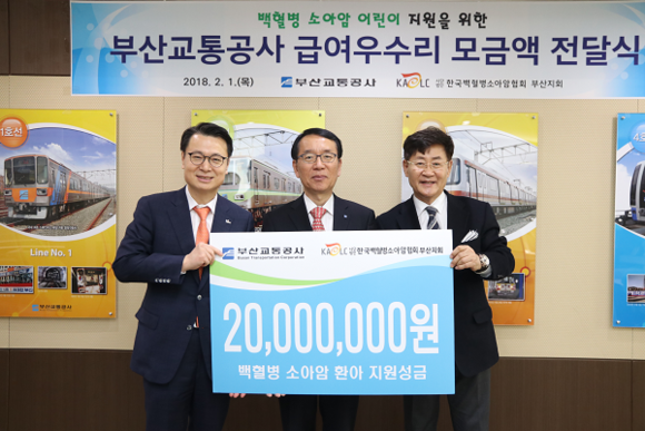 부산교통공사는 지난해 전 임직원의 급여우수리 2천만 원을 모아 한국백혈병소아암협회 부산지회에 전달했다고 1일 밝혔다.
