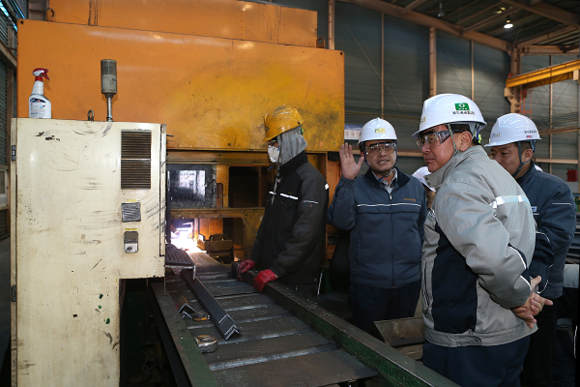 ▲화인중공업에서 진행된 스마트 공장 시연회에서 대우조선해양 이성근 조선소장이 무도면화 시스템에 대한 설명을 듣고 있다.