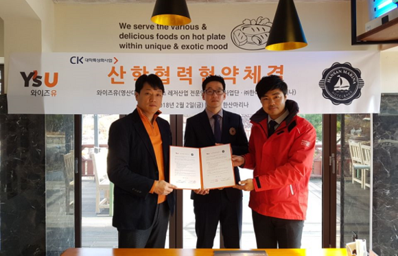 와이즈유 해양스포츠레저산업 전문인력 육성사업단의 김철우 단장(해양레저관광학과 교수)은 최근 거제마리나리조트(㈜대명레저산업 거제지점), 통영한산마리나호텔&리조트(㈜한어울)와 산학협력 교류협정을 맺었다고 5일 밝혔다.