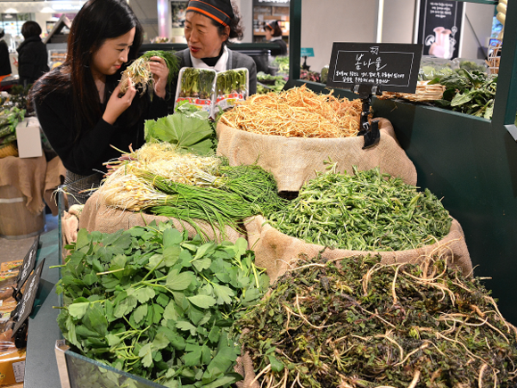 겨울 한파 속에서도 입춘(2/4)을 맞아 봄이 성큼 다가온 가운데, 백화점 식품관에는 봄 향기가 가득한 두릅, 냉이, 달래, 돌나물, 방풍나물 등 다양한 봄나물 상품이 나왔다. (사진제공=롯데백화점 부산본점)