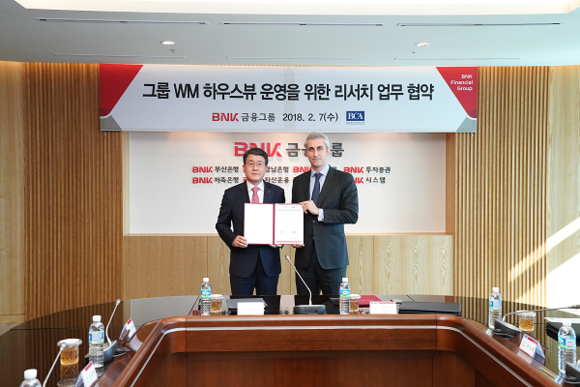 BNK금융그룹은 7일 오후 부산은행 본점에서 글로벌 독립리서치 기관인 캐나다의 'BCA리서치(BCA Research)'와 업무제휴를 체결했다.