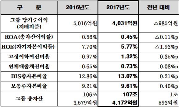 이는 `16년(5016억원) 대비 985억원 감소한 실적으로, 3분기까지는 누적 당기순이익 4863억원으로 전년동기 대비 292억원(6.4%) 증가해 양호한 흐름을 보였으나, 4분기 중 지역경기 부진과 그룹의 선제적인 건전성 관리에 따라 대손충당금이 크게 증가한 것이 다소 부진한 실적의 주된 요인이라고 그룹 측은 설명했다.