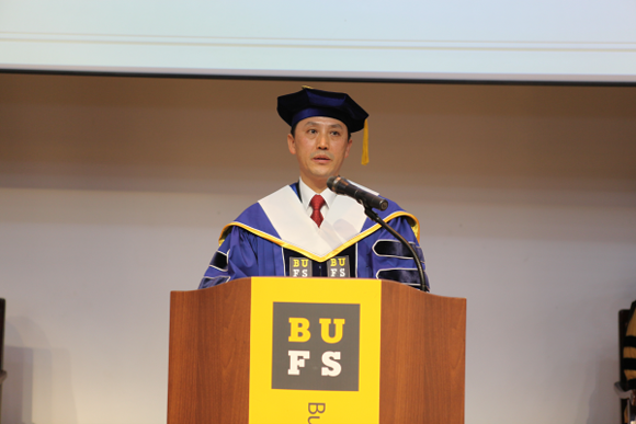 ▲부산외대 정기영 신임 총장이 취임식에서 취임사를 하고 있다. (사진제공=부산외대)