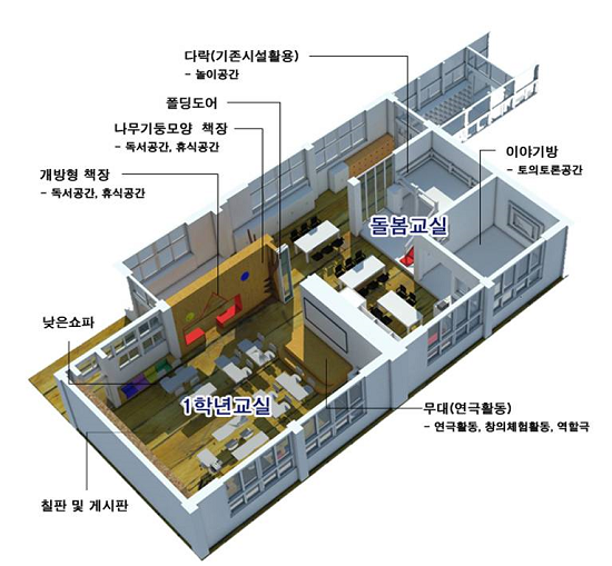 이에 따라, 5개 학교는 신체표현활동, 아동극연습활동 등 예술활동을 할 수 있는 소극장형 공간, 토의·토론을 위한 원탁을 설치한 수업공간, 암벽타기, 댄스 등을 할 수 있는 실내 스포츠 문화 교실, 안락한 쉼터가 있는 놀이교실 등 다양한 기능을 갖춘 수업공간을 갖춘다.