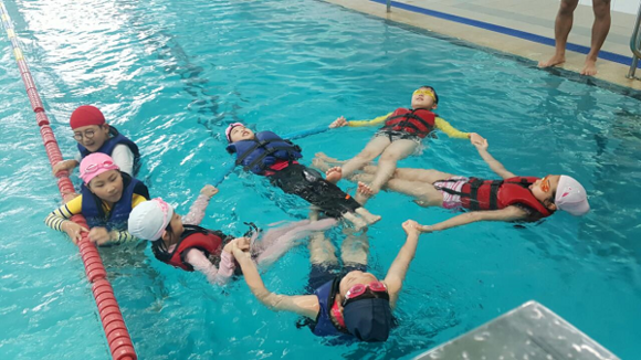 한국해양대 평생교육원은 학교별로 하루 4시간씩 이틀간에 걸쳐 해양대 수영장에서 입수법, 물적응, 부력체험, 생존수영 기본영법, 자기구조법, 타인구조법 등 체험중심 생존수영 실습교육을 한다.