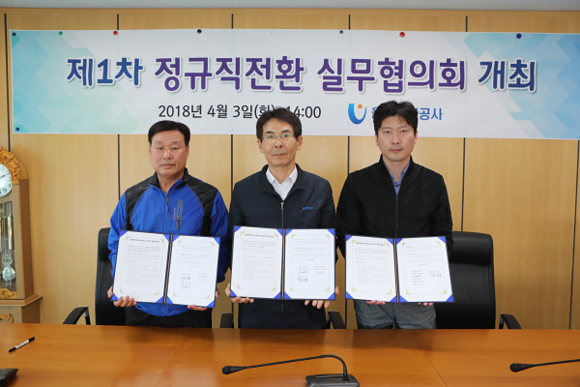 실무협의회 개최에 앞서, 공사 대표, 시설관리 및 시설경비 근로자 대표가 참석한 가운데 자회사 설립을 통한 시설관리 및 시설경비 근로자 33명의 정규직 전환을 위한 합의문에 서명했다.