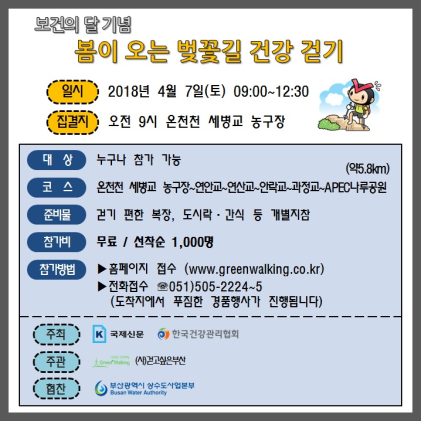 '보건의 달 기념 봄이 오는 벚꽃길 건강 걷기'라는 주제로 온천천 세병교를 출발해 갈맷길 8코스인 수영강 APEC나루공원까지 약 5.8km에 걸친 도심 생태걷기로 진행되며, 참가자를 위한 메디컬 체크, 문화예술 공연과 함께 도심 속에서 봄기운을 만끽하는 걷기 축제로 추진될 예정이다.