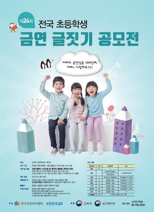 한국건강관리협회 부산건강검진센터는 소년한국일보와 함께 교육부와 보건복지부 후원으로 '제24회 전국 초등학생 금연글짓기 공모전'을 개최한다.