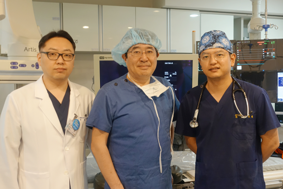 ▲왼쪽부터 구포성심병원 순환기내과 최규남 과장, 아사쿠라 교수, 순환기내과 신호철 심혈관센터장. (사진=구포성심병원)