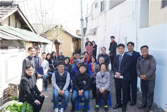 ▲HUG STREET 1호 사업 완료를 축하하는 '시와 그림이 있는 골목 개장잔치' 개최 후 관계자(스파크 민영서 대표, HUG 사회적가치실현팀 김세명 팀장, 대전문화유산 울림 안여종 대표, 소제창작촌 유혜경 대표 등) 및 주민들이 함께 기념촬영을 하고 있다. (사진=HUG)