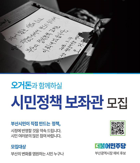 더불어민주당 오거돈 부산시장 예비후보 선거대책본부는 '불통 시정'을 바로잡고 시민 행복의 시민 중심 시정을 위해 '시민정책보좌관'을 모집한다고 10일 밝혔다.