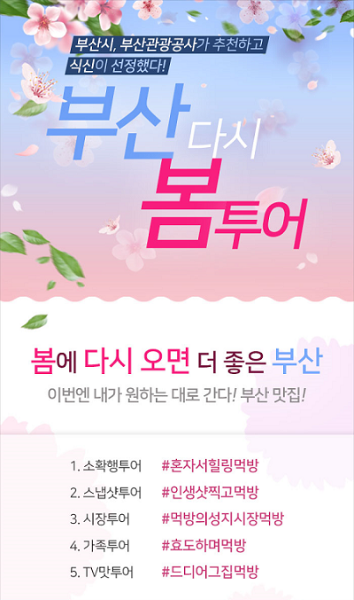 부산관광공사는 부산관광앱플랫폼 협력업체인 ㈜식신과 함께 오는 16일부터 6월 10일까지 봄철 '부산의 맛' 특집 프로모션을 진행한다고 11일 밝혔다.