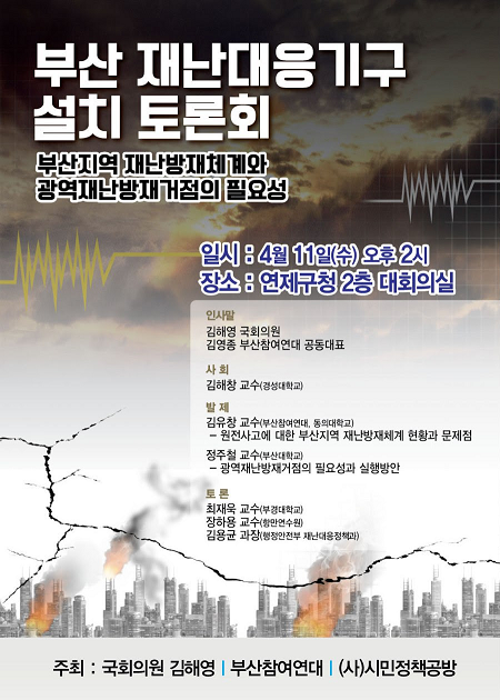 더불어민주당 김해영 의원(부산 연제·정무위)은 부산참여연대, (사)시민정책공방과 공동으로 11일 오후 연제구청에서 '부산 재난대응기구 설치방안 – 부산지역 재난방재체계와 광역재난방재거점의 필요성'이라는 주제로 첫 부산정책 수요간담회를 연다고 밝혔다.
