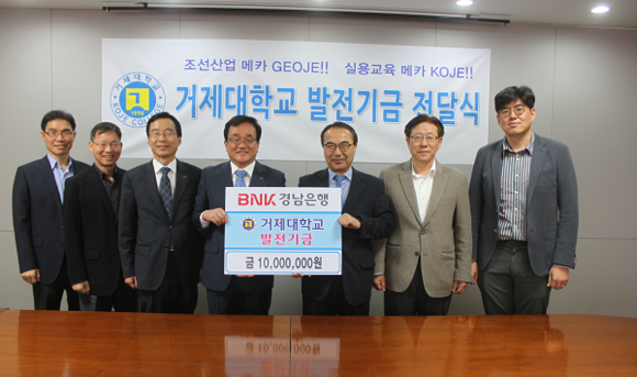 이날 발전기금 전달식에는 경남은행 김영모 서부본부장을 비롯해 최영균 거제 옥포지점장과 거제대 전영기 총장, 교무위원이 참석했다.