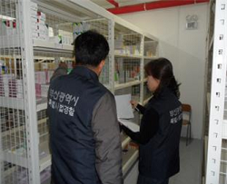 ▲의약품 보존 및 관리사항 등 단속 모습. (사진=부산시)