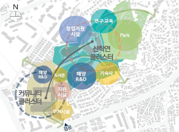 그리고 자연녹지지역에 위치한 외성생활관 등 10개의 건물이 대부분 30년 이하로 상태가 비교적 양호해 건물을 리모델링해 조선/해양산업관련 엔지니어링 시설, 해양 R&D센터, 창업지원센터, 시민도서관, 연합기숙사 등 '산·학·연 클러스터'로 조성할 예정이다.