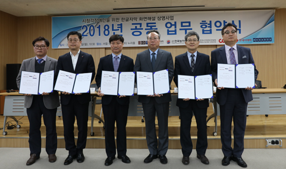 영화진흥위원회는 16일 서울 이룸센터에서 한국농아인협회, 한국시각장애인연합회, 씨제이씨지브이(주), 롯데시네마(주) 시네마사업본부, 메가박스(주)와 공동으로 시청각장애인을 위한 한글자막 화면해설 상영 사업 2018년도 공동 업무협약식을 가졌다.