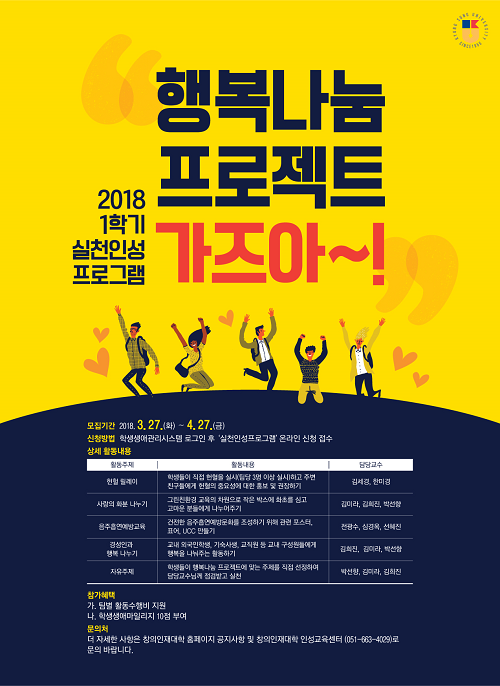 경성대학교 창의인재대학 인성교육센터는 오는 5월 30일까지 5주간 '행복나눔 프로젝트'를 주제로 올해 1학기 실천인성 프로그램을 진행한다고 18일 밝혔다.