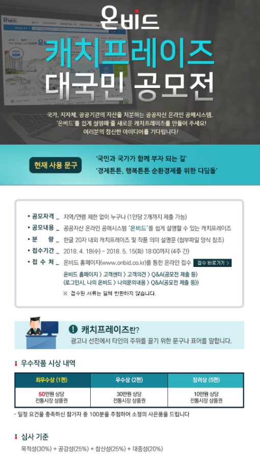 이번 공모전은 국가, 지자체, 공공기관 등의 자산을 국민 누구나 거래할 수 있는 온라인 공매시스템인 '온비드'를 널리 알리고 국민 눈높이에 맞춘 홍보 문구를 발굴해 보다 많은 국민들이 온비드를 이용할 수 있도록 도움을 주기 위해 마련됐다.