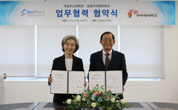 국립부산과학관과 김해가야테마파크는 18일 국립부산과학관에서 콘텐츠 제휴를 통한 공동 프로모션 및 과학문화 확산을 위한 업무협약을 체결했다.