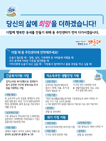 부산 해운대구는 이달 말부터 기존 지원이 중지돼 어려움에 봉착하는 대상자, 국민기초수급자보다는 급여 지원이 비교적 낮은 차상위계층 등 어려움이 예상되는 대상자에게 자체 제작한 정보 안내지를 발송하는 다복동 특화사업 '바로 발굴 사업'을 추진한다고 25일 밝혔다.