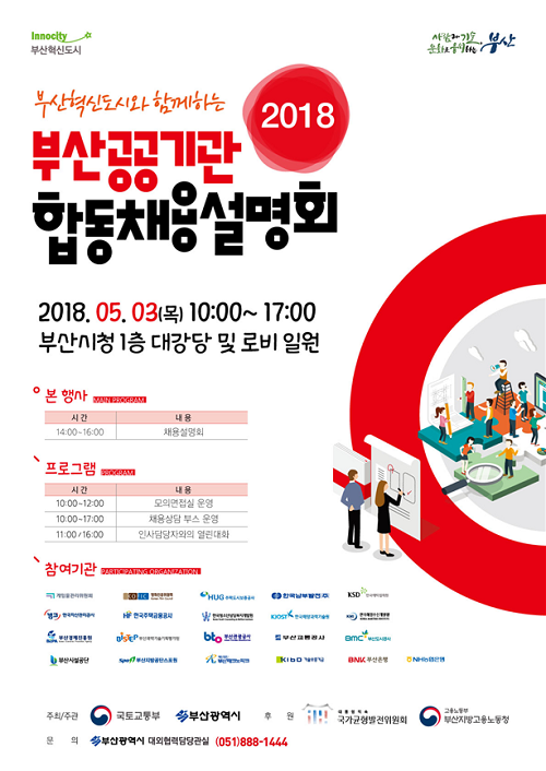 부산시는 다음달 3일 오후 2시 부산시청 1층 대강당에서 부산지역 대학생 및 취업준비생을 대상으로 부산지역 공공기관 채용정보 제공을 위한 '부산혁신도시와 함께하는 2018 부산 공공기관 합동채용설명회'를 개최한다고 30일 밝혔다.