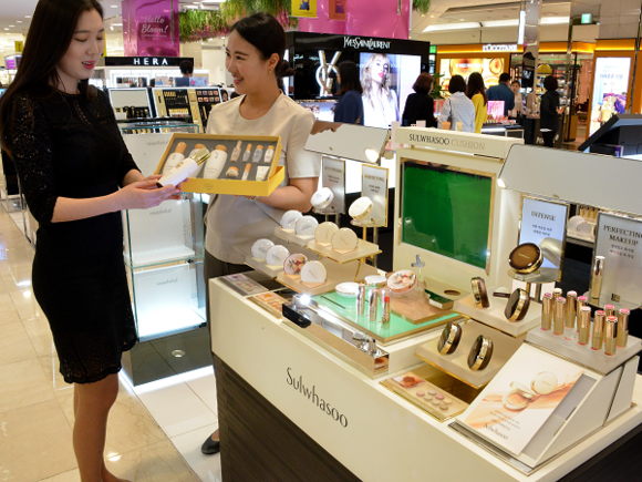 ▲롯데백화점 부산본점 1층 화장품 설화수 매장에서 고객이 어버이날 선물로 마련된 화장품 기획세트 상품을 둘러보고 있다. (사진=롯데백화점)