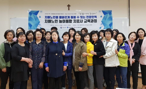 부산가톨릭대학교는 지난달 30일 교내 메리놀관에서 예비 요양보호사 및 사회복지사를 대상으로 '치매노인 놀이통합 치료사 교육과정' 1기 개강식을 진행, 오는 9월까지 베이비부머 및 경력단절 여성, 청년 미취업자 100여명을 대상으로 치매전문인력 양성에 나선다.