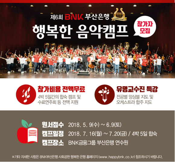 국내외 유명 교수진 25명이 참여하는 '제6회 BNK 행복한 음악캠프'는 7월 16일부터 4박 5일간 부산은행 기장연수원에서 진행되며, 캠프 마지막 날인 7월 20일에는 부산은행 본점 대강당에서 시민들을 대상으로 수료연주회를 무료로 개최한다.