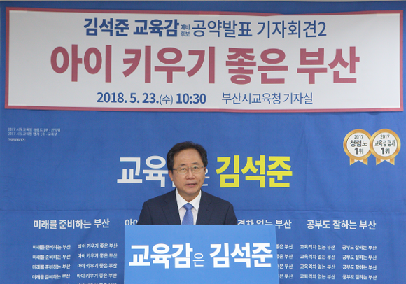 김석준 부산시교육감 예비후보는 23일 부산시교육청에서 기자회견을 열고, 두 번째 공약인 '아이 키우기 좋은 부산'을 만들기 위한 계획을 발표했다.