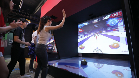 ▲롯데백화점 부산본점 지하 2층에 오는 26일 새롭게 선보이는 스크린 스포츠 테마파크 '레전드 히어로즈'에서 고객들이 컬링을 즐기고 있다. (사진=롯데백화점)