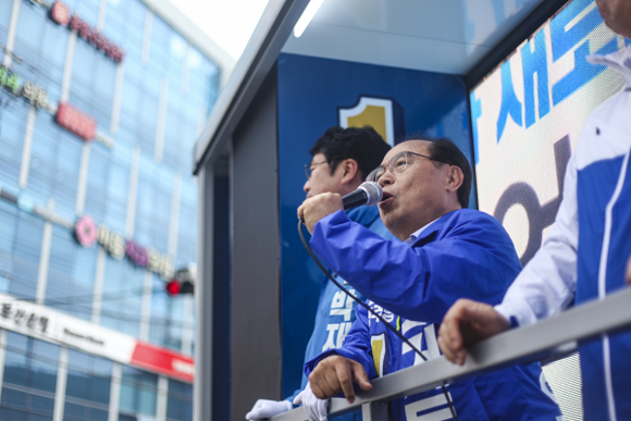 ▲민주당 오거돈 부산시장 후보가 31일 남구 일대에서 박재범 남구청장 후보과 공동 유세를 하고 있다.